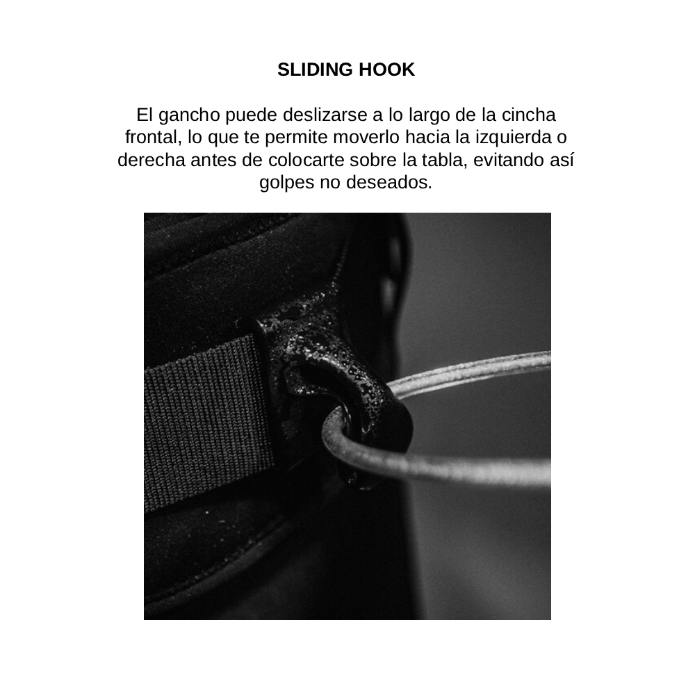 Compatible tanto para usuarios diestros como zurdos, incluye además un gancho deslizante y un bolsillo para cuchillo de kite, todo integrado en un contorno suave y aerodinámico que no interfiere en tus movimientos.